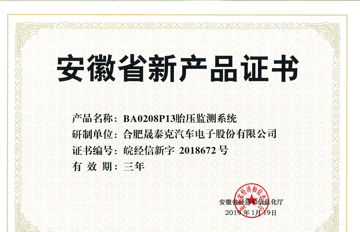 2019年新產(chǎn)品證書-胎壓監(jiān)測(cè)系統(tǒng)