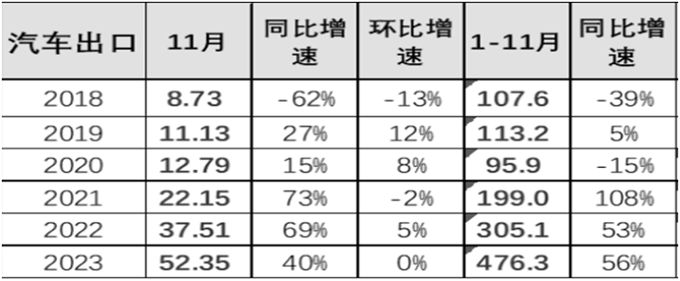 中國于2009年超越美國成為全球最大的汽車生產(chǎn)國和消費(fèi)國。據(jù)中國汽車工業(yè)協(xié)會(huì)公布報(bào)告顯示,2023年1-11月中國汽車實(shí)現(xiàn)出口476.3萬臺(tái),出 口增速56%的持續(xù)強(qiáng)增長。中國已成為新能源汽車最大的生產(chǎn)國和出口國,約占世界的一半。在這個(gè)意義上,中國汽車產(chǎn)業(yè)已經(jīng)換道超車,從“跟隨者”變成“領(lǐng)跑者”,正引領(lǐng)著這場波瀾壯闊的全球汽車革命,這也是中國從汽車大國邁向汽車強(qiáng)國的重要里程碑。